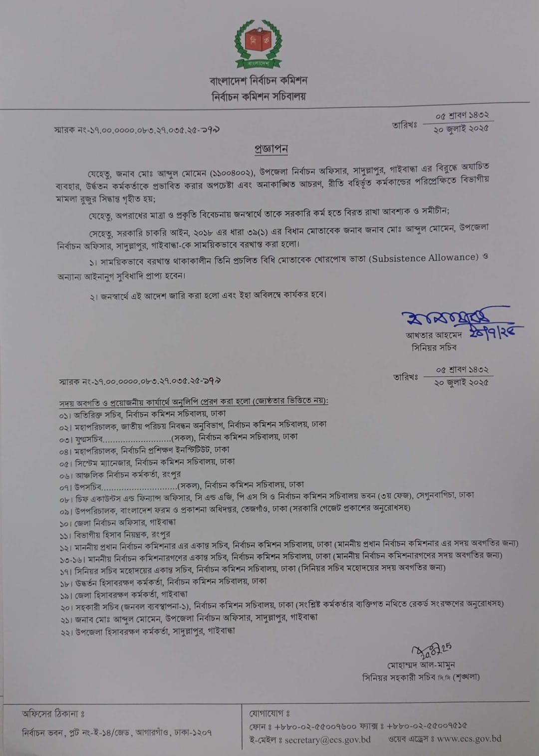 (নং-৩৪০) জনাব শুধাংসু কুমার সাহা, প্রাক্তন অতিরিক্ত আঞ্চলিক নির্বাচন কর্মকর্তা, বরিশাল বর্তমান সিনিয়র সহকারী সচিব (সাময়িক বরখাস্তকৃত), নির্বাচন কমিশন সচিবালয় এর বিরুদ্ধে বিভাগীয় মামলা নাং- ০২/২০১৮ এ বিগত ৩০-০৫-২০১৯ তারিখের বেতন বৃদ্ধির স্থগিত দন্ডাদেশ এতদ্বারা রদ-রহিত করে অত্র বিভাগীয় মামলার দায় হতে তাকে অব্যাহতি প্রদান করার প্রজ্ঞাপন।